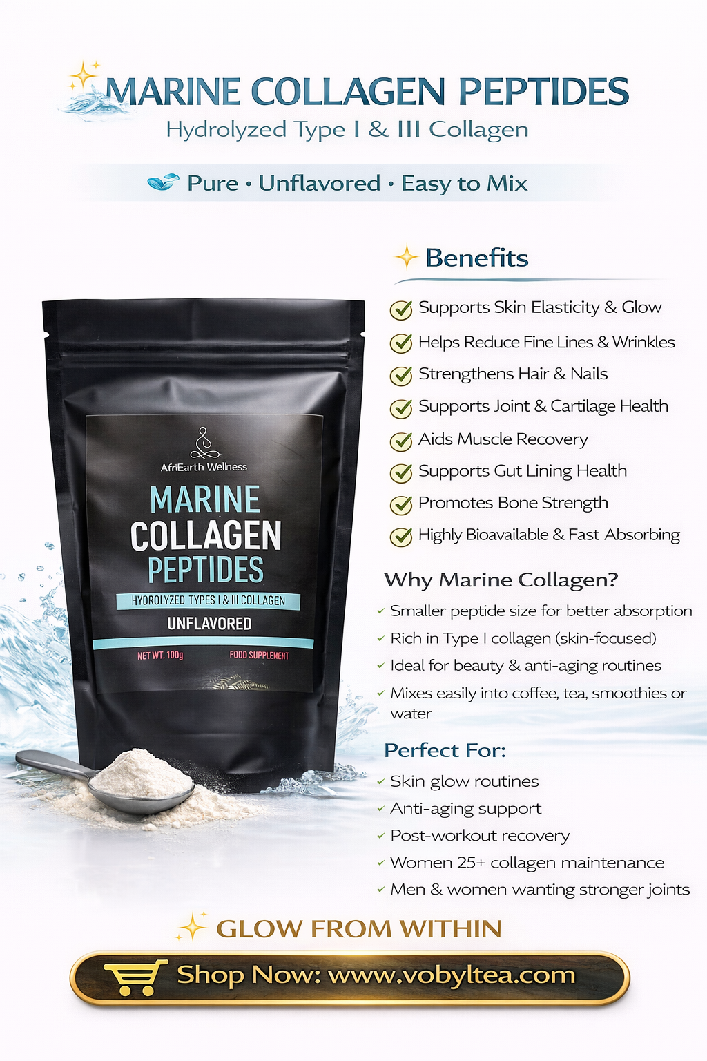 Boost your wellness with Vobyl Tea’s top supplements: Bovine Collagen, Maca, and Ashwagandha. Sourced from natural, non-GMO ingredients, these capsules enhance skin, joint health, libido, and vitality. Crafted in Kenya, they offer trusted, organic support for a healthier you in every dose!