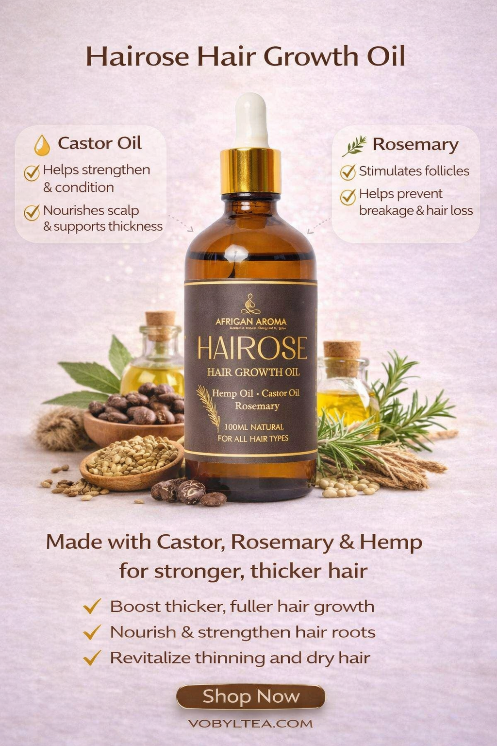 HairRose Oil is a powerful fusion of hemp seed oil, rosemary, and castor oil, crafted to restore, strengthen, and grow your hair naturally.