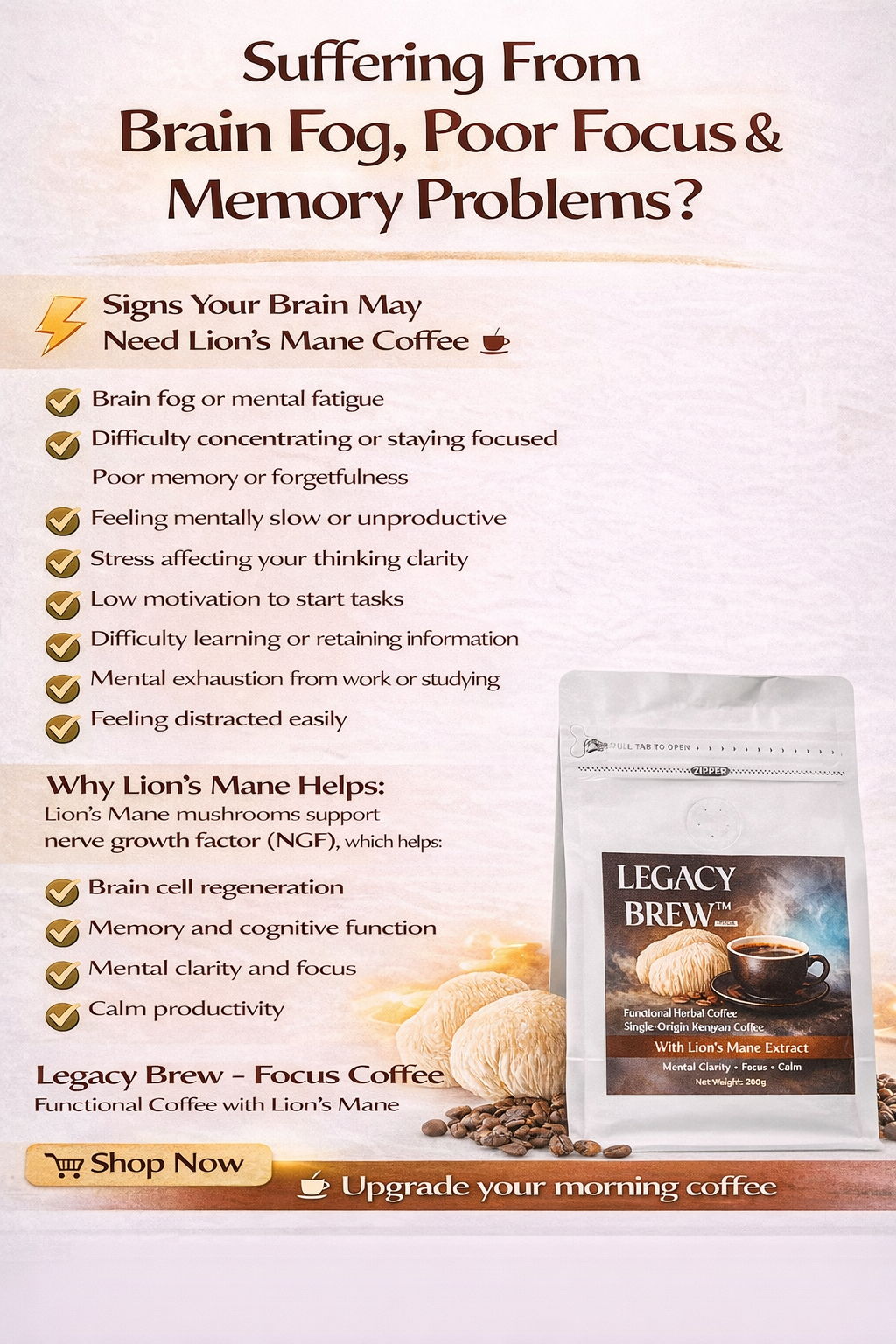 Legacy Brew – Focus blends premium coffee with Lion’s Mane mushrooms to support mental clarity, concentration, and calm alertness. Designed for thinking, creating, and working without overstimulation, it delivers smooth energy that helps you stay present and focused.