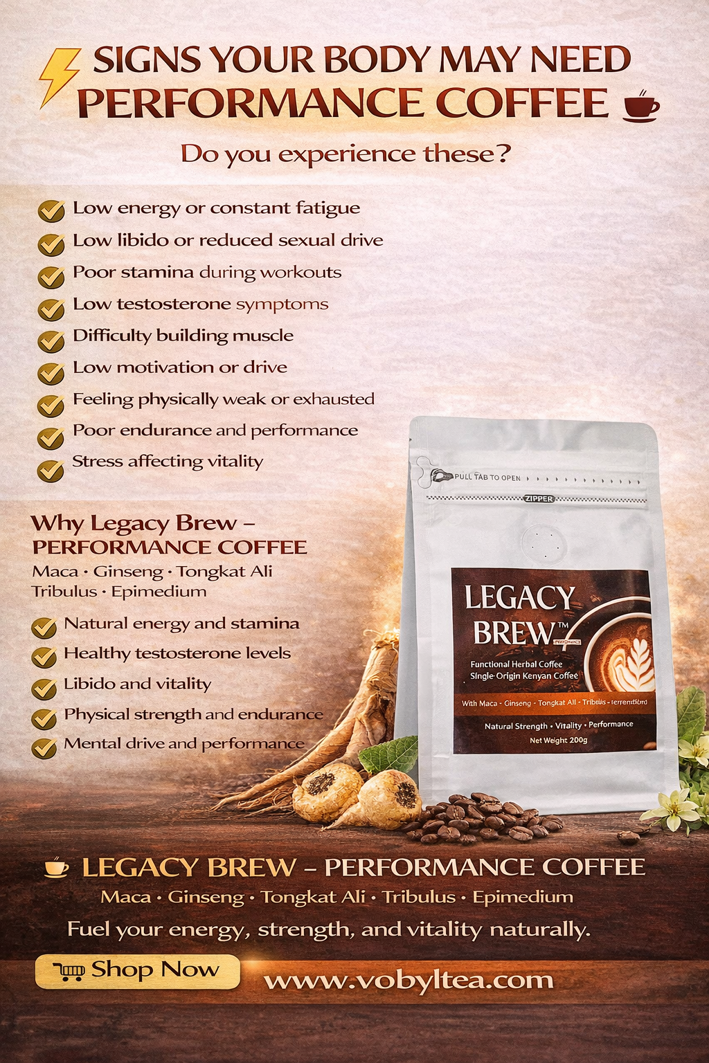 It combines bold, premium coffee with Maca, Ginseng, Tongkat Ali, Tribulus Terrestris, and Epimedium (Horny Goat Weed) — functional botanicals traditionally used to support stamina, circulation, and performance drive.